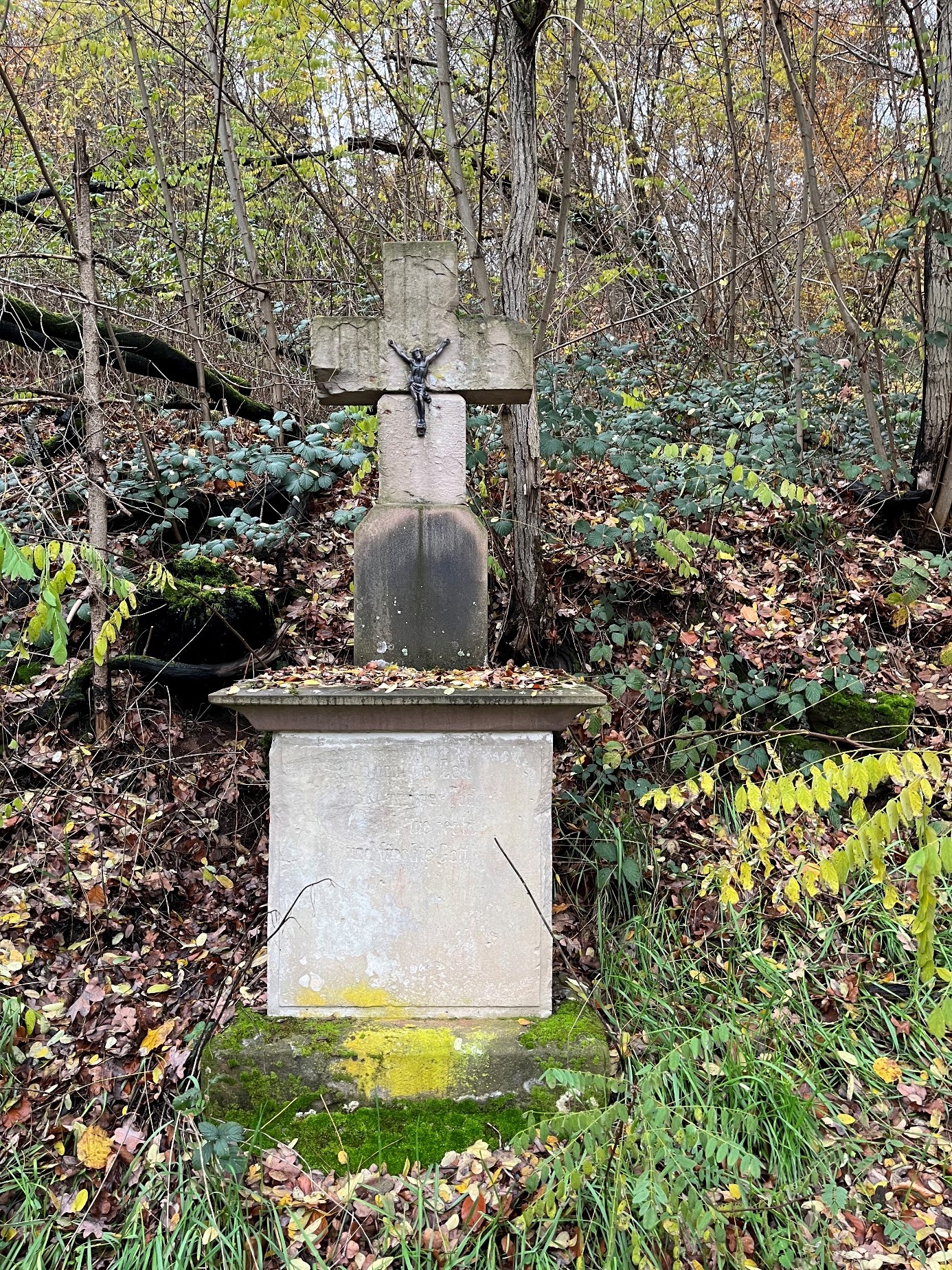 An der rechten Straßenseite der L 170, 600 Meter hinter der Banngrenze von Weiler, steht am Feldweg, der zum Kohlenbrucher Bach führt, ein schlichtes, wuchtig wirkendes Wegekreuz. Es ist aus mehreren Blöcken zusammengesetzt, die ursprünglich wahrscheinlich nichts miteinander gemein hatten. Das aus rötlichem Sandstein gefertigte Kreuz trägt einen gusseisernen Christus-Corpus. Es war vermutlich Teil eines aufgelassenen Grabmals: es enthält die Lebensdaten einer 1931 verstorbenen Frau. Das Kruzifix ruht auf einer flachen Mensa aus Sandstein, die dem Denkmal anlässlich einer Restaurierung zugefügt worden sein dürfte. Das rechteckige Mittelstück ist ein heller Kunststein ebenfalls neueren Datums. Die Inschrift ist eine Mahnung an alle am Weg vorbei Kommenden: „(es) vergeht die Zeit, es naht der Tod, drum tue recht und fürchte Gott.“Der quaderförmige Sockel ist aus rötlichem Sandstein und wahrscheinlich so alt wie das Kreuz selbst. |