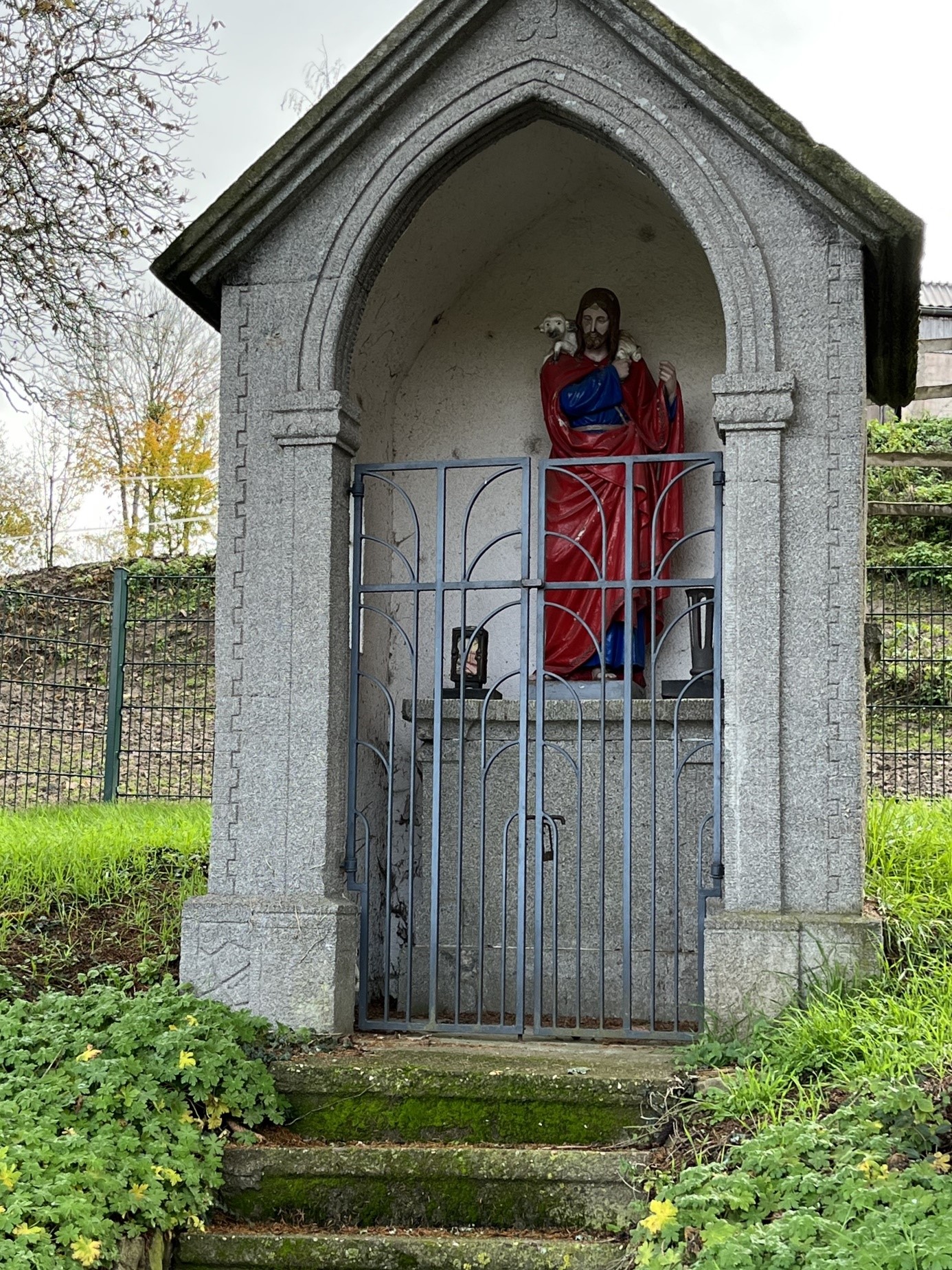 Im Innern des Bildstocks steht ein schlichter steinerner Altar, auf dem eine Christusfigur, eingehüllt in ein rotes Ober- und ein blaues Untergewand, ruht. Auf den Schultern Jesu ruht ein Lamm, die Versinnbildlichung des Bibelwortes aus dem Johannes-Evangelium „Seht, das Lamm Gottes, du nimmst hinweg die Sünde der Welt“.