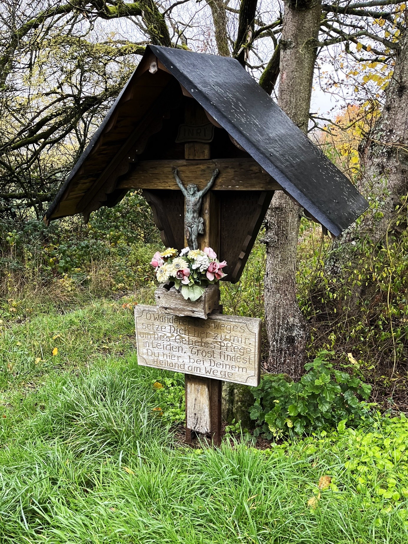 Kurz hinter dem letzten Haus in der Straße Zum Saargau in Richtung Fitten steht linksseitig ein stets blumengeschmücktes Holzkreuz. Es ist mit einem Spitzdach versehen und rückseitig beplankt. Unter dem Corpus des Gekreuzigten befindet sich die auf einer hölzernen Tafel eingebrannte Inschrift „O Wanderer Des Weges/setze Dich her zu mir/um des Gebetes Pflege/in Leiden, Trost findest/Du hier, bei Deinem/Heiland am Wege“. Eine Inschrift, wie man sie ähnlich an anderen Wegekreuzen, die entlang viel begangener Straßen und Wege stehen, sehen kann. |