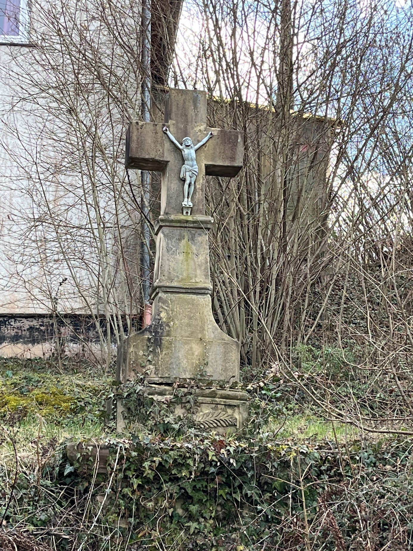 In der Saarmühlenstraße befindet sich im Vorgarten des Anwesens Nr. 16 ein aus der Mitte des 19. Jh. stammendes Wegekreuz. Der Überlieferung nach soll es sich um ein weiteres Menninger Pestkreuz handeln, ein Indiz dafür, dass der Ort in der frühen Neuzeit von der Pest oder vergleichbaren Epidemien doch stark in Mitleidenschaft gezogen wurde. Das von Efeu bewachsene Wegekreuz ist aus hell-beigem Sandstein gefertigt. Im sich nach oben verjüngendem Schaftteil erkennt man die Inschrift „Nur ein Vaterunser“. In das darunter befindliche geschwungene Mittelteil sind, leider nur noch schwer lesbar, die Jesusworte (Matthäus-Evangelium 11,28) eingemeißelt: „Kommet alle zu mir, die ihr mühselig und beladen seid, ich will Euch erquicken“. Das wuchtige Kruzifix ist ein griechisches Kreuz mit gleich langen Balken. Der gusseiserne Korpus – in der Form des Vier-Nagel-Typus – ist silbergrau gestrichen.. |