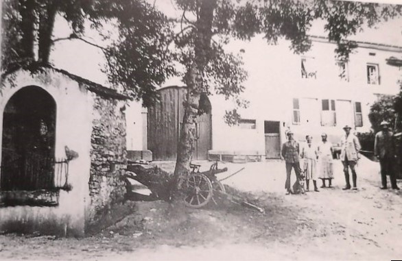 An der Silwinger Straße 2, im Eckbereich Unterdorfstraße, befand sich vor dem Bauernhaus der Familie Thinnes dieses alte, aus Bruchsteinen gemauerte Heiligenhäuschen (Oratorium) mit einer Figur eines Heiligen. Errichtet wurde es wahrscheinlich bereits im 19. Jh. Das Foto stammt aus dem Jahr 1927.  An Fronleichnam diente es als Altar, an dem der dritte eucharistische Segen gespendet wurde. Im Verlauf des Baues der neuen Landstraße von der Dörrmühle nach Mondorf, der heutigen L 381, musste das Heiligenhäuschen 1935 abgerissen werden.  |